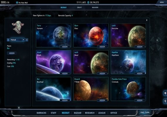 Una vez que hayas reclutado a tus gladiadores a través del draft, ojeadores, misiones, intercambios o adquisiciones, tendrás que gestionar su moral y personalidad mientras los equipas para la batalla en los duros entornos de combate de varios mundos. Recluta personal de apoyo, mejora tu cuartel general, recoge recompensas, investiga tecnologías, construye tu cuartel general, participa en misiones secundarias y gestiona la riqueza y la reputación de tu imperio a medida que crece cada día.