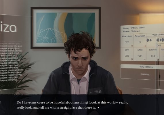 Eliza ist ein visueller Roman über ein KI-Beratungsprogramm, die Menschen, die es entwickeln, und die Menschen, die es benutzen. Begleite Evelyn Ishino-Aubrey dabei, wie sie Menschen aus ihrer Vergangenheit wiedertrifft, die Menschen in Seattle kennenlernt, die Eliza zur Beratung nutzen, und über den Verlauf ihrer Zukunft entscheidet.