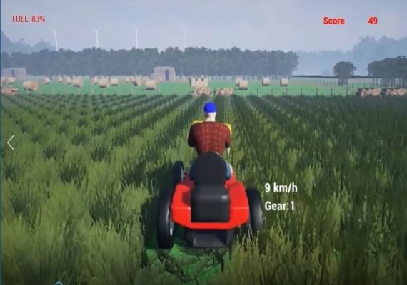 Lanwmover Spiel, in dem Spieler Rasenmäher fahren und Gras in einer großen offenen Welt schneiden, die Gras, Häuser und andere Hindernisse enthält.