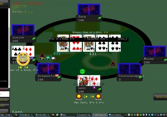 Die Spieler fordern Chips vom Gastgeber des Tisches an (einer der Spieler am Tisch ist immer der Gastgeber) - alles über den Tisch wird in einer Textdatei für die spätere Spielanalyse aufgezeichnet. Viele Standard-Homegame-Funktionen, die in anderen Softwarelösungen nicht verfügbar sind, wie z. B. Mehrfachdurchläufe - lassen Sie das Spiel einmal, zweimal, dreimal oder öfter laufen! Machen Sie eine unterschiedliche Anzahl von Durchläufen für jeden (Seiten-)Topf! Straddle! Sagen Sie die Zeit an! Alle Regeln werden von Ihnen festgelegt!