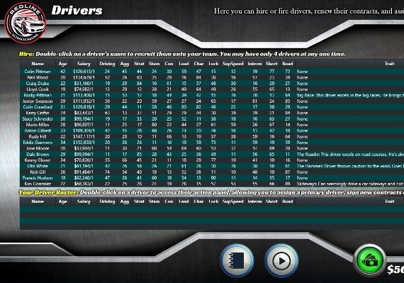 • Contrata hasta 4 pilotos para tu equipo, cada uno con 13 estadísticas diferentes, incluyendo "peculiaridades" especiales posibles para cada uno. Contrata también jefes de equipo con 10 estadísticas y peculiaridades diferentes. Compite contra otros 40 pilotos y toma las decisiones financieras de tu equipo para llevarlo a la prosperidad. Fírmales contratos para mantenerlos en tu equipo.