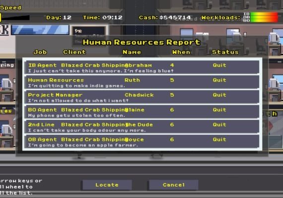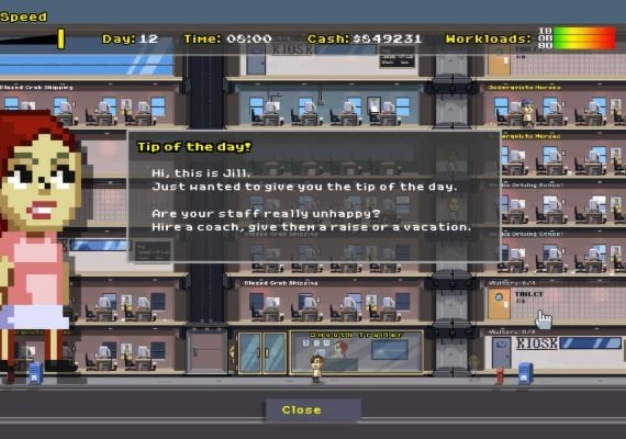 Everything is upgradable! Hire projects managers to unlock new technologies, and improve your offices and employees. If your account managers bring you new contracts, pressure your employees with managers to increase their productivity.