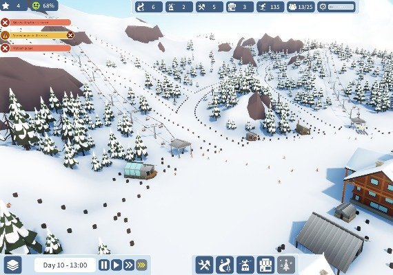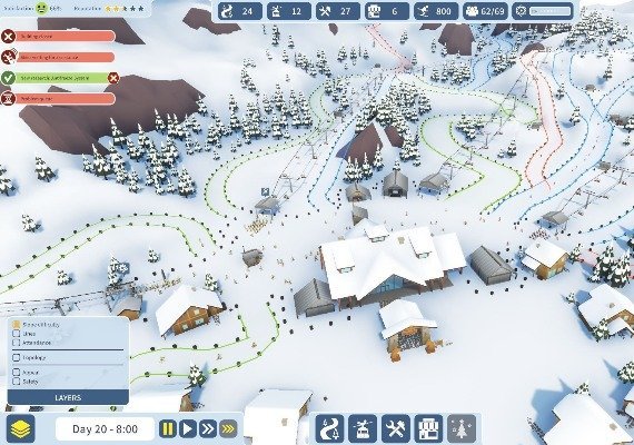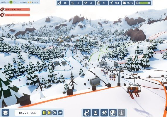 Build the ideal ski resort to keep your skiers smiling all the way down the mountain. Get to know every cliff and crevice as you plan pistes, place lifts and build essential facilities. Take on the challenge to create a resort where life is always good! Place pistes on the mountainside in just a few clicks with the easy-to-use creation tool. Read the terrain, and choose the best spot to lay down trails for every skier ability. 11 different types of ski lift give you plenty of choice for scaling the heights. 12-person gondola lifts are fast, but tricky to build on the steep mountain slopes. A two-person chairlift might be a better choice, but watch out for queues at the bottom! Luckily, ever-advancing ski lift technology means there are always new options to try. The latest models can make even the highest peaks accessible in no time.
