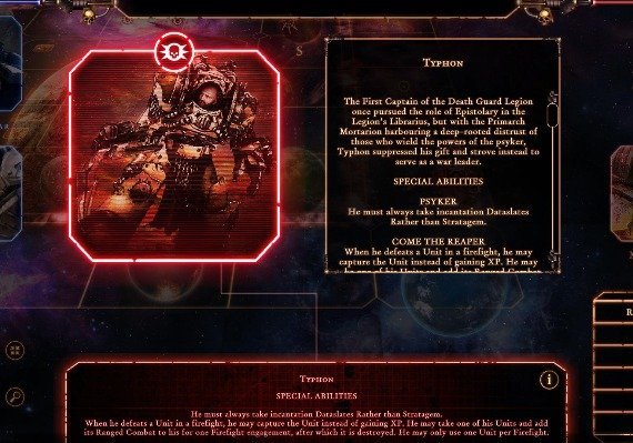 The First Captain of the Death Guard Legion once pursued the role of Epistolary in the Legion's Librarius, but with the Primarch Mortarion harbouring a deep-rooted distrust of those who wield the powers of the psyker, Typhon suppressed his gift and strove instead to serve as a war leader.