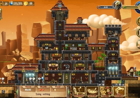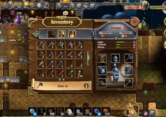 At the outset you find the recipes for basic tools and items, and build a small house with places to sleep and eat. Then, the size of the tribe increases and catches the attention of other inhabitants of the world. Most of them are night creatures and dwell underground. The worlds are full of fantasy creatures like zombies, skeletons, goblins, beholders, ghosts, giant spiders, and others. Some of them pay little attention to the dwarves, as long as the dwarves do not come into their field of vision. Others gather into quite large groups and try to break into the dwarves’ residence.