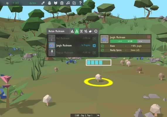 Puedes empezar a crear tus ecosistemas colocando plantas y animales en tu mundo. Tener una gran variedad de plantas y árboles hará que el terreno sea más fértil y permitirá que florezca la vida salvaje, mientras que los animales empezarán a hacerte ganar puntos que podrás utilizar para comprar diversos recursos del juego.