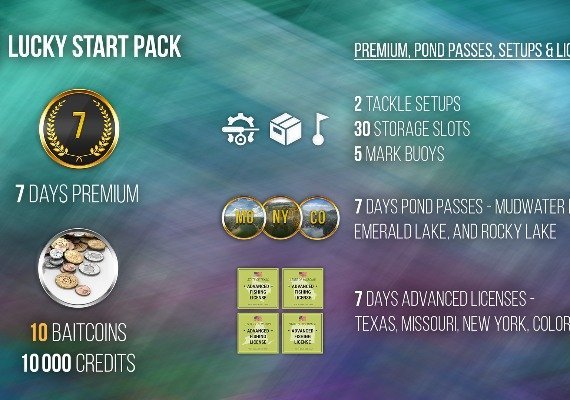 Yup, it’s possible RIGHT NOW with this amazing Lucky Start Pack! The goodies in this exclusive Pack for our new Fishing Planet friends include all the necessary tackle, pond passes, equipment, fishing licenses and even Premium Account that’ll help you advance faster and get the most out of your fishing experience! Don’t limit yourself! You can tune in and feel the drive of some hardcore fishing right now - just grab the Lucky Start Pack and head on to Mudwater River or beautiful lakes Emerald and Rocky to land some predators like Bass, Pike or Trout! Skip the routine and get access to 3 awesome fishing destinations NOW! Catch Trophy Bass and Pike on Missouri and Emerald Lake while enjoying Trout fishing on Lake Rocky! Durable rods and reels, awesome tackle, 7-day Pond Passes and Advanced Licenses along with exclusive Cap and Keepnet available only in this Pack!