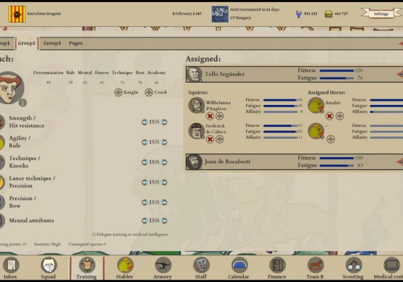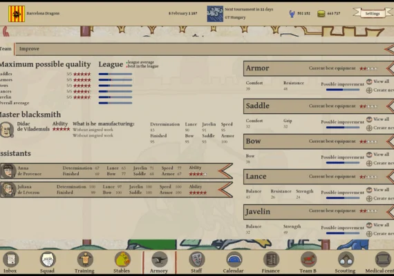 Budget Wisely: Manage your gold coins carefully to cover salaries, horse upkeep, facility upgrades, and armory improvements. Maintaining your team’s equipment is a constant challenge—armor and weapons degrade season after season, pushing you to invest wisely.