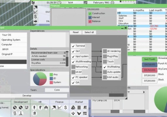 Construct and design buildings for optimal working conditions. Hire people to design and release software, so you can defeat the simulated competition and take over their businesses. Manage and educate your employees to make sure they are skilled and satisfied with their job.