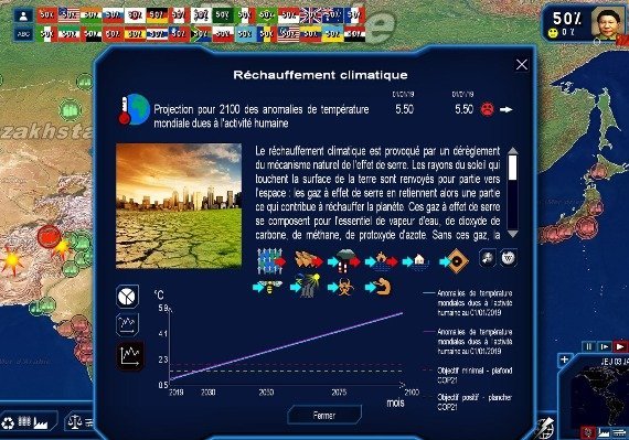 - Global Warming - One specific scenario, "Global Warming", based on the goals of the IPCC (Intergovernmental Panel on Climate Change), has the objective of limiting global warming to 1.5° Celsius for 2100, and to reduce CO2 emissions by 45% by the year 2030. As the head of the 30 largest CO2 emitters, initiate a global energetic transition by pursuing policies on infrastructures (dismantling of thermal power industries, constructing power plants with renewable energies…), finance (taxes on petroleum products, carbon tax...), the environment, innovations (CO2 capture, development of electric vehicles…)… and all while avoiding energy shortages and maintaining a balanced budget as well as social stability!