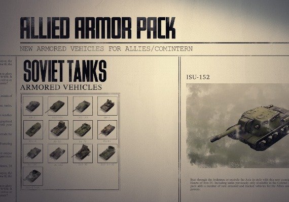 - Pack de blindés alliés - plus de 50 modèles de véhicules blindés pour les armées américaine, soviétique, britannique et française, dont le M7 Priest, le char français Renault et une multitude de nouveaux destructeurs de chars.