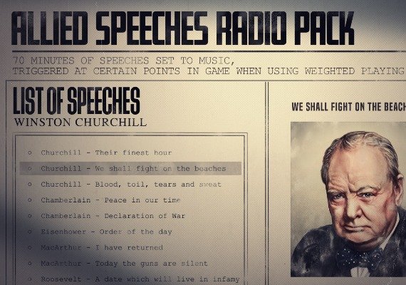 - Pack de discours alliés - plus de 70 minutes de discours des moments les plus inspirants de la campagne alliée contre la tyrannie, y compris le célèbre "Je reviendrai" de MacArthur et la promesse de Churchill de "se battre sur les plages".
