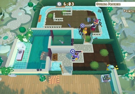 In Tools Up! gather your team of up to 4 players and organize the treehouse. Patio Party! You may now plant trees, water flowers, cut grass, and do a lot more things because we're outside. But be alert - someone could be lurking in the bushes!