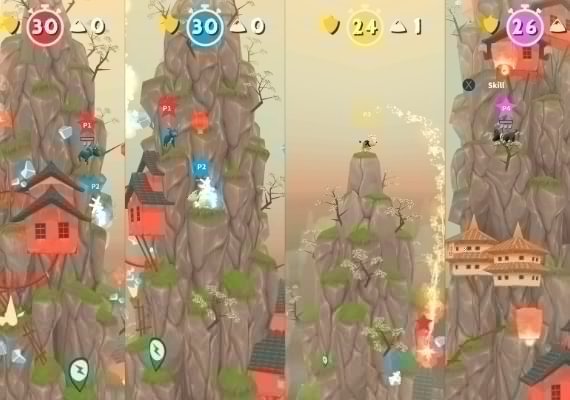 GoatPunks unterstützt bis zu 4 Spieler in Kopf-an-Kopf-Action mit geteiltem Bildschirm. Schnappen Sie sich Ihre Controller und machen Sie sich bereit, loszulegen. Schilde, Waffen und Power-Ups sind auf dem Berg verstreut, und wenn du es schaffst, deine Ziege auf den Gipfel zu bringen, haben alle anderen Ziegen einen gemeinsamen Feind: dich!