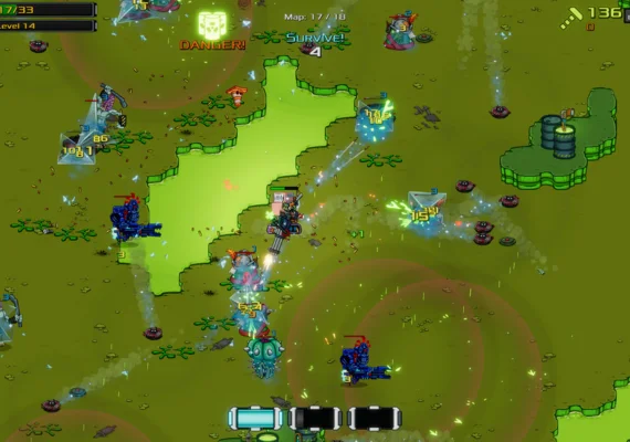 The colorful sci-fi aesthetic and post-apocalyptic vibe create a lively battlefield, perfect for arcade shooter fans, enhanced by a high-energy soundtrack.