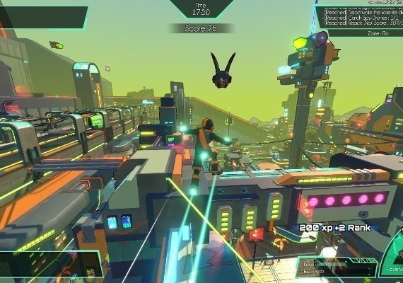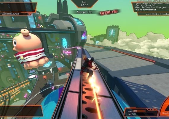 The game takes place in ECP17, a high-tech city also called Hover City by its inhabitants and located on a distant planet. The Great Admin cut the communication with the Galactic Union and established a strong dictatorship. Having fun has become illegal and entertainment is banished.You're in charge of a team of young rebels, the Gamers, fighting against the new anti-leisure laws oppressing the city. Equipped with high-tech gears allowing amazing jumps and speed, they roam the city to sabotage the propaganda, help citizens, and find a way to reach the Orbital Station. This way they could warn the Galactic Union and put an end to the oppression. Hover is both a single and multiplayer experience. At any time you can instantly switch from offline to online mode and join your friends or players from around the world and progress through the adventure by cooperating or playing against them. No matter where you are and what you’re doing, you’ll be able to connect. Hover is also a community-driven game offering many tools to players to create missions or mini games.