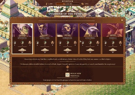 The "Campaign" mode will help you get started by teaching you the game basics while allowing you to experience a unique story and delve into all aspects of life in ancient Egypt. With stunning 2D graphics and a fully upgraded soundtrack, you'll feel transported back in time as you build and manage your city. To help you keep track of your progress, various indicators will show you the overall well-being of your city and its residents.