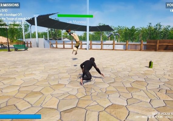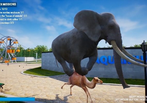 Play as up to 5 different animals: A monkey, an elephant, a giraffe, a fish and a penguin. Everyone can interact with the environment (weapons, vehicles, objects, NPCs). Each animal has its own specificity, the giraffe can propel itself with its neck, the penguin can slide and waltz everything it encounters, the fish spits water to propel itself into the air.