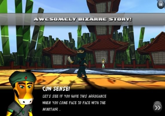 From a peaceful training village to a hell-like demon world, you control Ninja Guy! You will guide him on his bizarre and epic quest to prove himself to the Holy Cow Sensei by bringing down an evil gargantuan Minotaur! You are Cow Sensei's last hope, and final student .. Will you finally attain your Ninjaness?