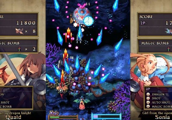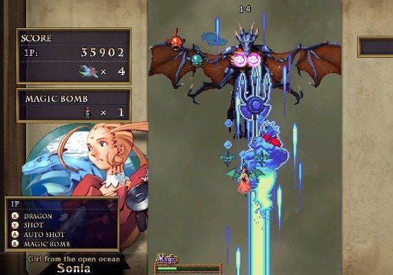 The heroes are the four dragon riders. They can use normal shots, bombs and magic shots (press and hold the button). In addition, they can also use the Dragon Shot.