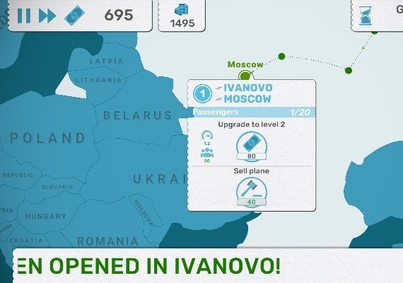 Rozwijaj własną sieć transportową w różnych krajach i miastach: otwieraj nowe trasy, kupuj nowe samoloty i ulepszaj je, zwiększaj przepustowość lotnisk!