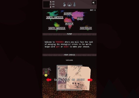 - Przesuwaj karty w lewo lub w prawo, aby podejmować mądre decyzje dotyczące powstrzymania epidemii wirusa na całym świecie. Powstrzymaj pandemię, zanim będzie za późno.