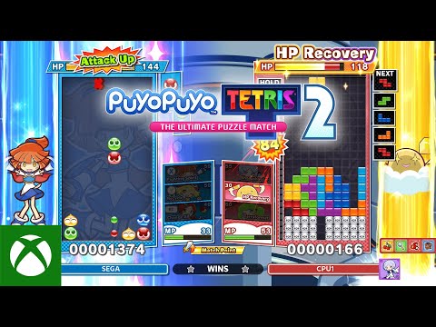 Japan’s beloved puzzle game series Puyo Puyo and the world-renowned Tetris game franchise have teamed up again to deliver even more Puyo-popping and Tetrimino-clearing fun in Puyo Puyo Tetris 2. Playing is easy: match 4 or more same-colored Puyos or complete a line of blocks to clear them from your board and dump Garbage into your opponent’s game. But keep an eye on what’s coming your way too.