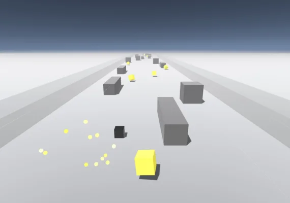 - Control a dark cube that moves forward automatically, aiming to collide with and break rotating golden cubes to earn one point each.