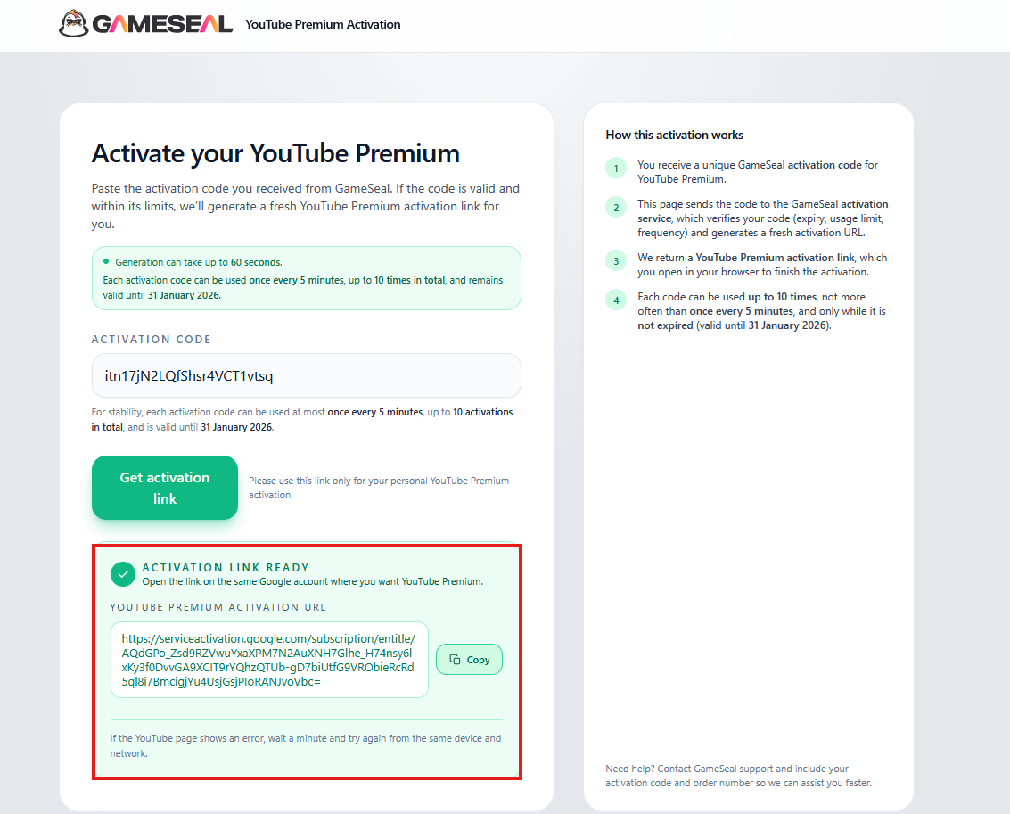 - Lipiți codul de activare pe site-ul youtube.gameseal.com.