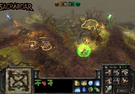Sacraboar is an RTS game in which players have to capture their opponent's boar trophy. Featuring an intuitive and easy to use resource management system, the game offers fast-paced game play without lengthy and tedious construction phases.During the game players can build towers, which either give them access to powerful spells or increase their budgets for producing units.