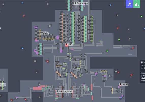 Shapez.io to gra polegająca na budowaniu fabryk w celu zautomatyzowania tworzenia i przetwarzania coraz bardziej złożonych kształtów na nieskończenie powiększającej się mapie.