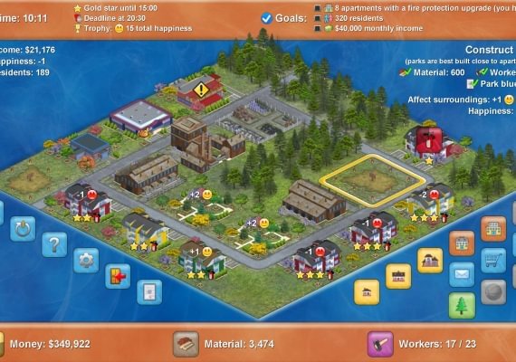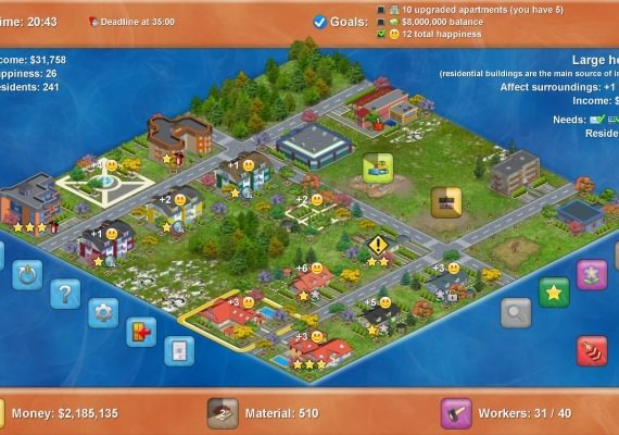 Construct an idyllic neighborhood with plenty of houses and keep your residents happy by providing all services they need, and they will reward you with a tidy profit. It’s up to you how to play - you can work your way to the top in the comprehensive campaign mode or you can create and play your own custom scenarios. Build dozens of houses, structures and other buildings. Trophies and awards available for the meticulous gamer!