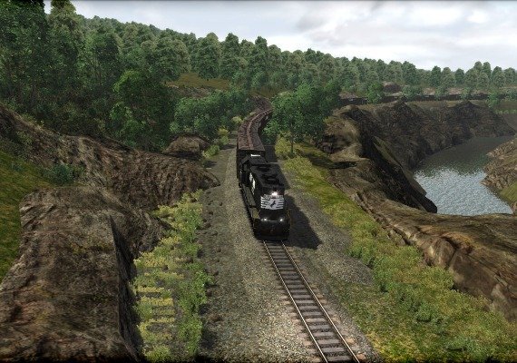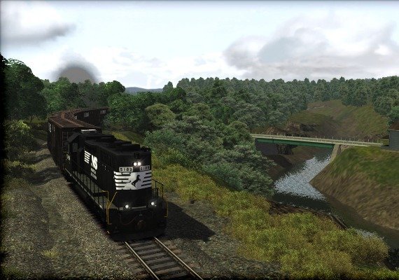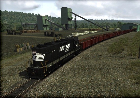 Most GP38-2 locomotives were built with a low hood, although some were built in high hood variant, as portrayed in the EMD GP38-2 for Train Simulator, which comes in Norfolk Southern black and thoroughbred liveries. Also included are low gondola freight cars, NS box cars and flat cars.